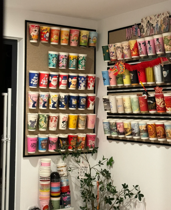 我妈说,把你平时喜欢喝的奶茶杯子留下来,准备一个毛毡板,把奶茶杯子全都固定在毛毡板上面,这不就是一个好看的装饰画吗?