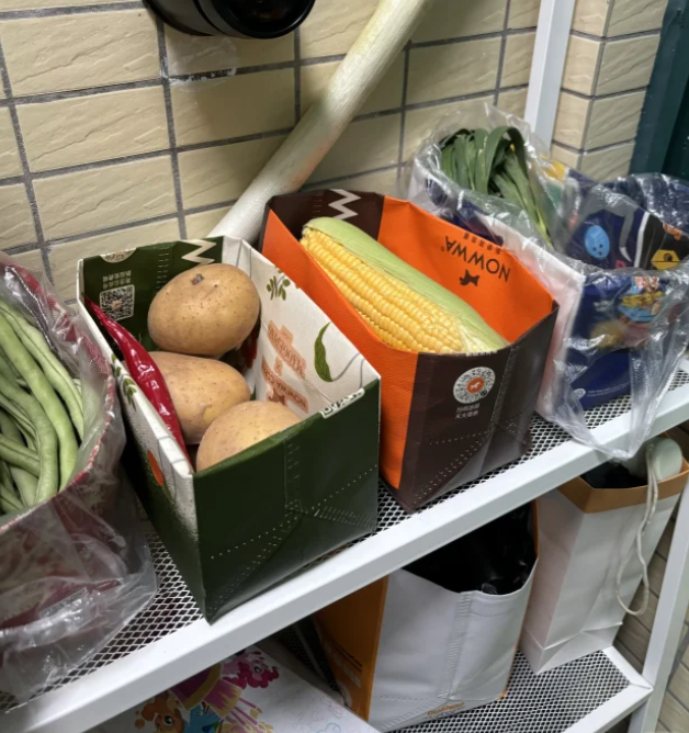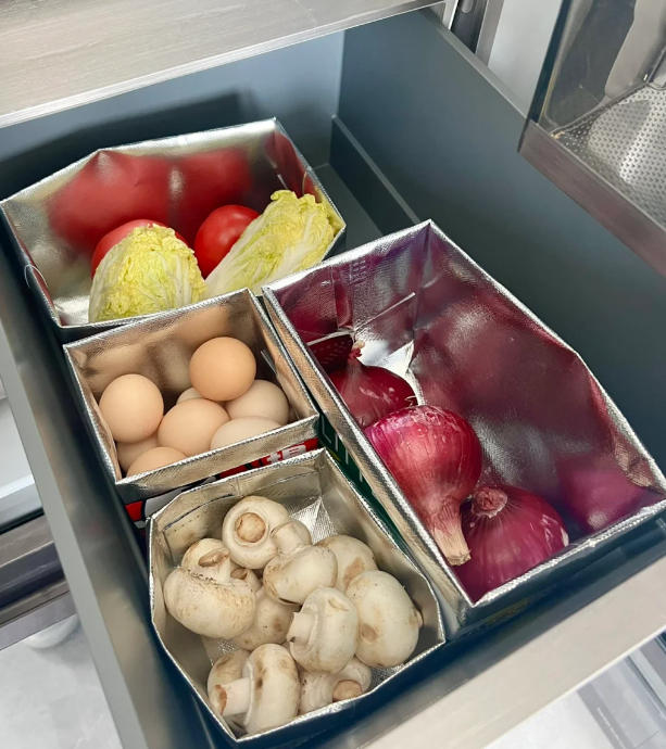 只需要把奶茶袋子折叠一下,然后放在冰箱里面,可以用来放瓜果蔬菜,还可以收纳各种物品。